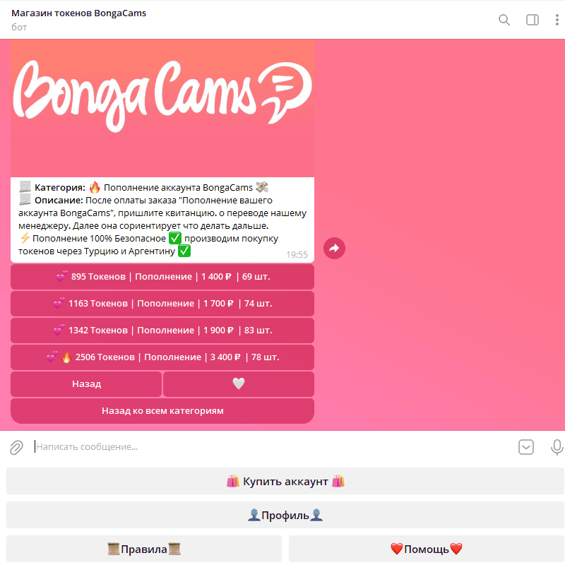 Для пополнения через Telegram-бот достаточно перейти по ссылке https://t.me/BongaCamsTokens_Bot, выбрать нужный пакет токенов, указать свой логин на BongaCams и следовать инструкциям бота. Покупка занимает всего несколько минут, а полученные токены сразу отобразятся на вашем аккаунте.